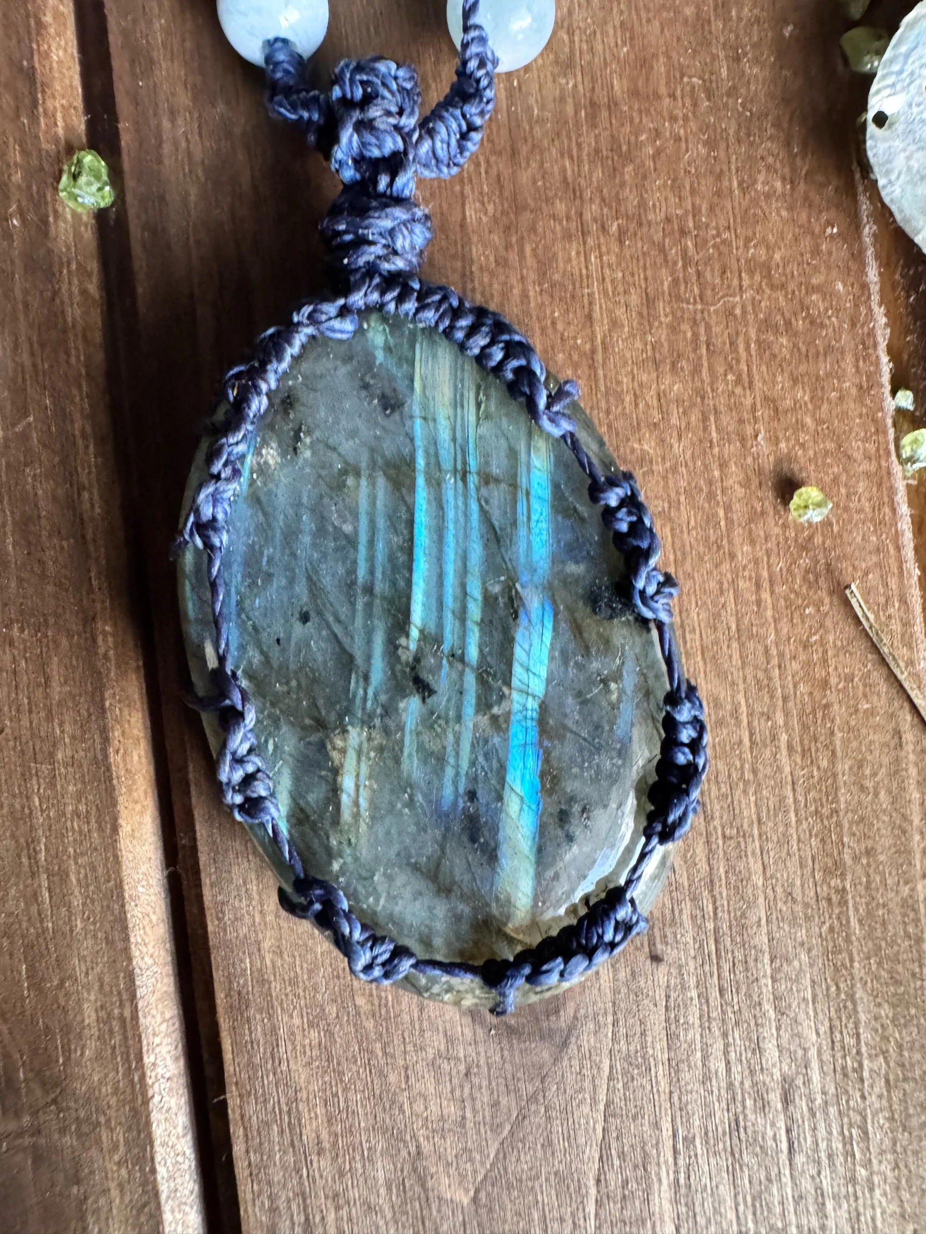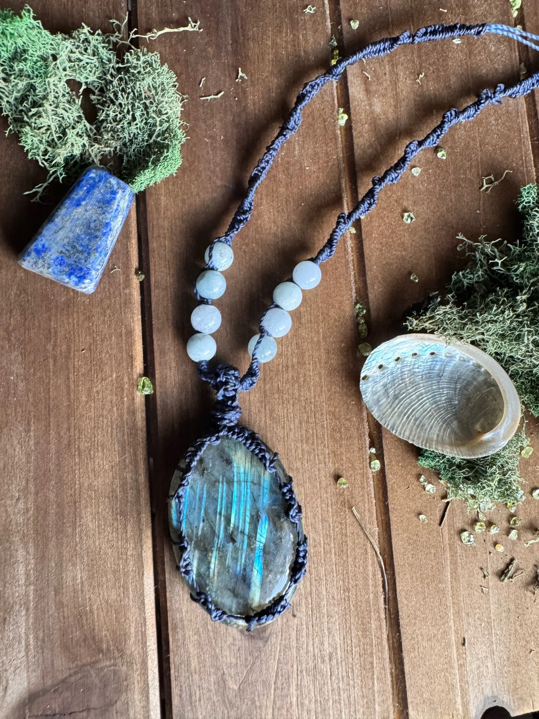 Labradorite awakens inner wisdom, strengthens spiritual connection, and protects your energy as you step into your true power. Hand-woven in macrame with intention, this necklace carries both grounding and ethereal energy-perfect for the modern goddess who walks between worlds.